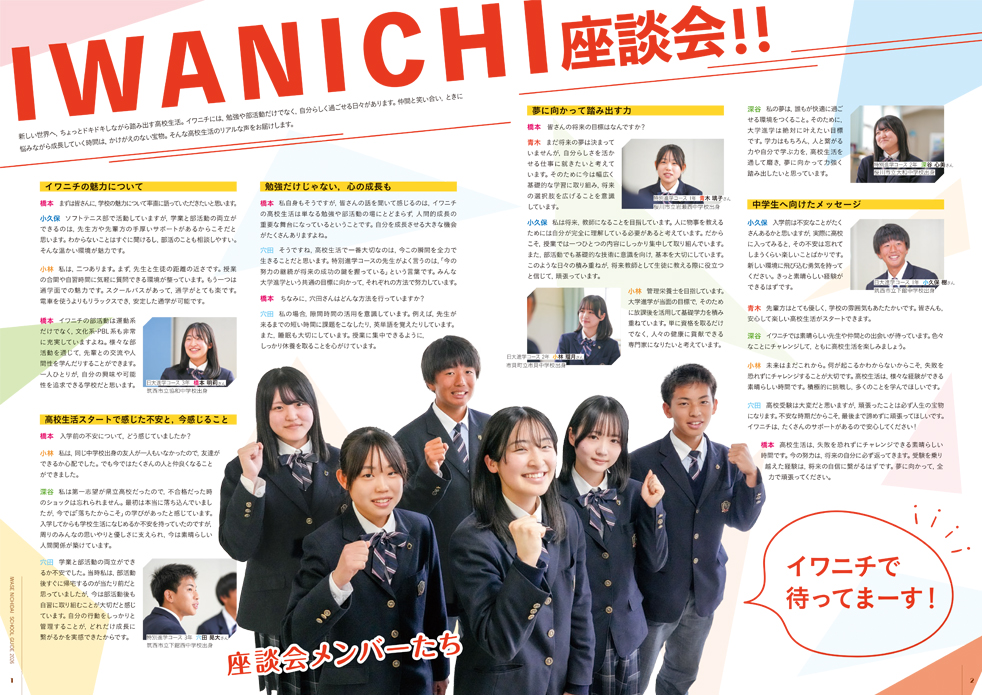生徒インタビューを豊富に取り入れ、在校生のリアルな声を通して学校生活の魅力を伝える構成。明るさを感じさせるビジュアルで、のびのび成長できる学校像を表現しました。
